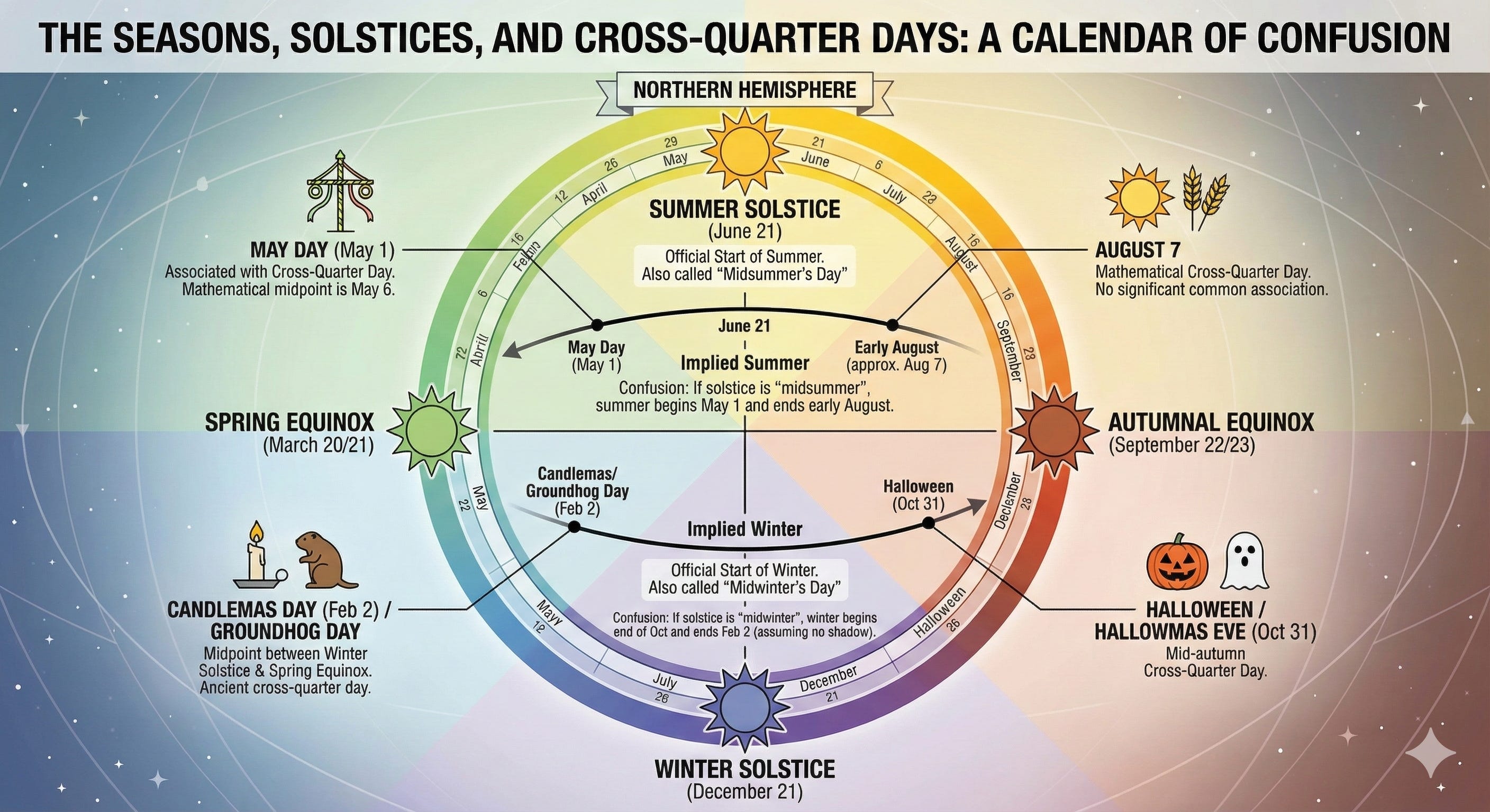 Interestingly, this system of equinox, solstice, and cross-quarter days has led to some confusion as to when the seasonal midpoints and endpoints occur. For example, June 21 is the official date for the start of summer in the Northern Hemisphere, but it is sometimes referred to as midsummer’s day. This would suggest that summer actually begins on May Day and ends in early August. In a similar manner, December 21, the start of winter for the Northern Hemisphere, is sometimes referred to as midwinter’s day. This would imply winter actually begins at the end of October and concludes (assuming no shadow is seen) on Groundhog Day.